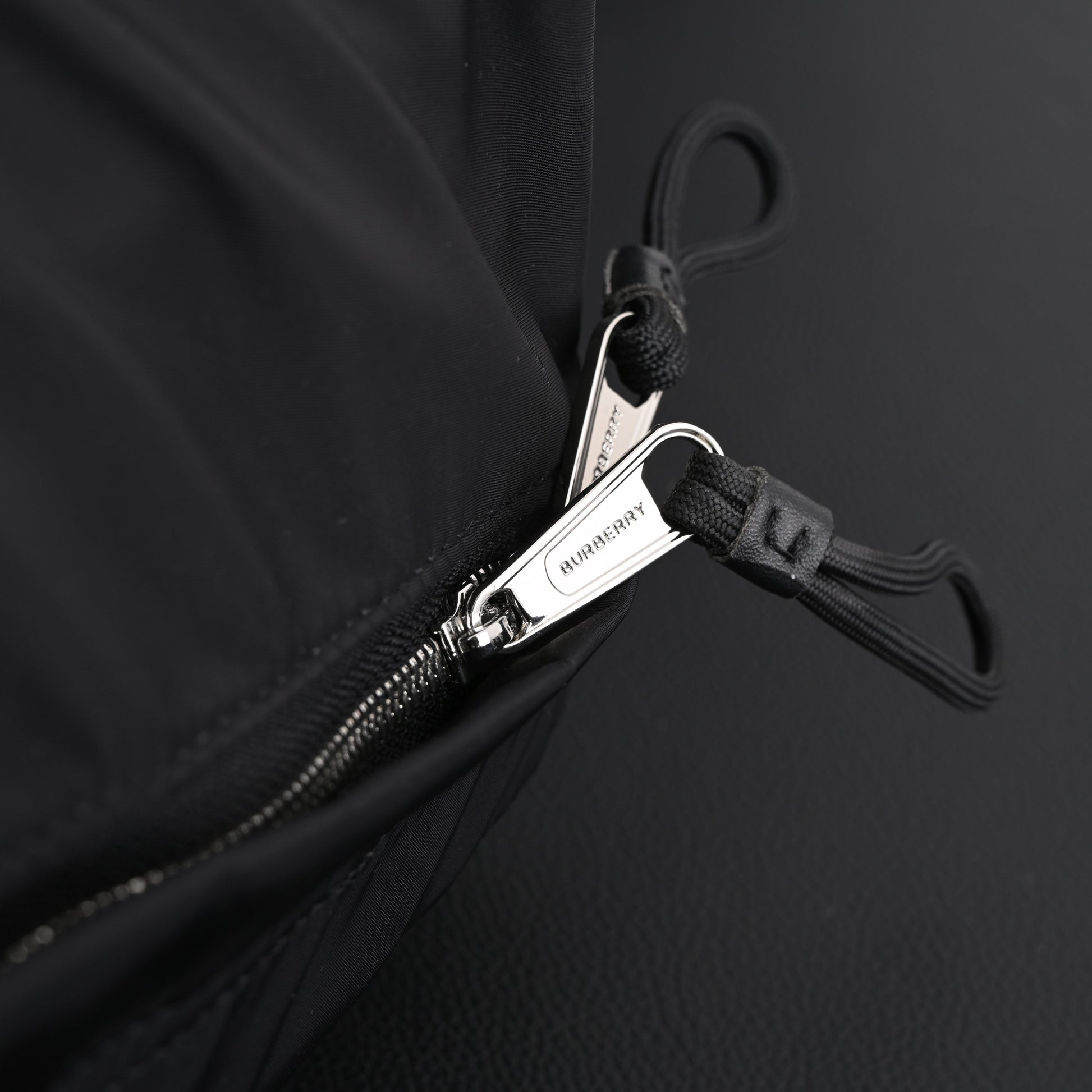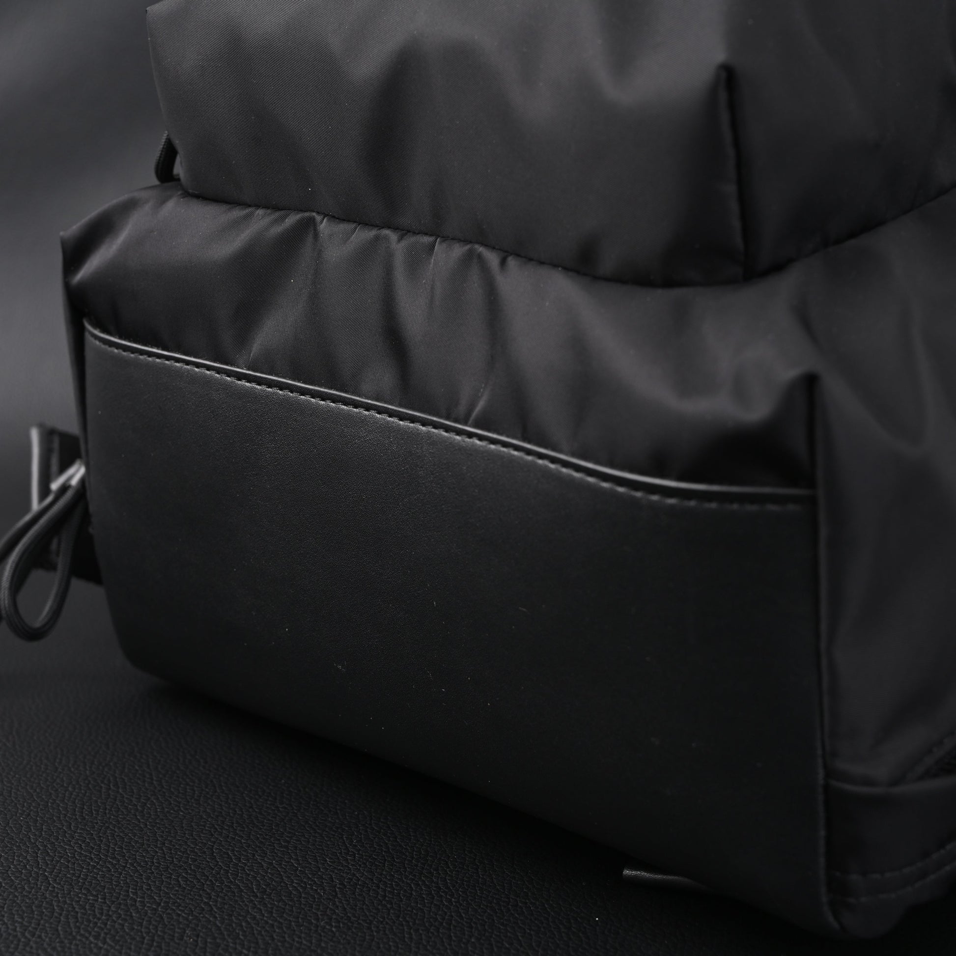 Material: Black nylon with smooth leather detailing