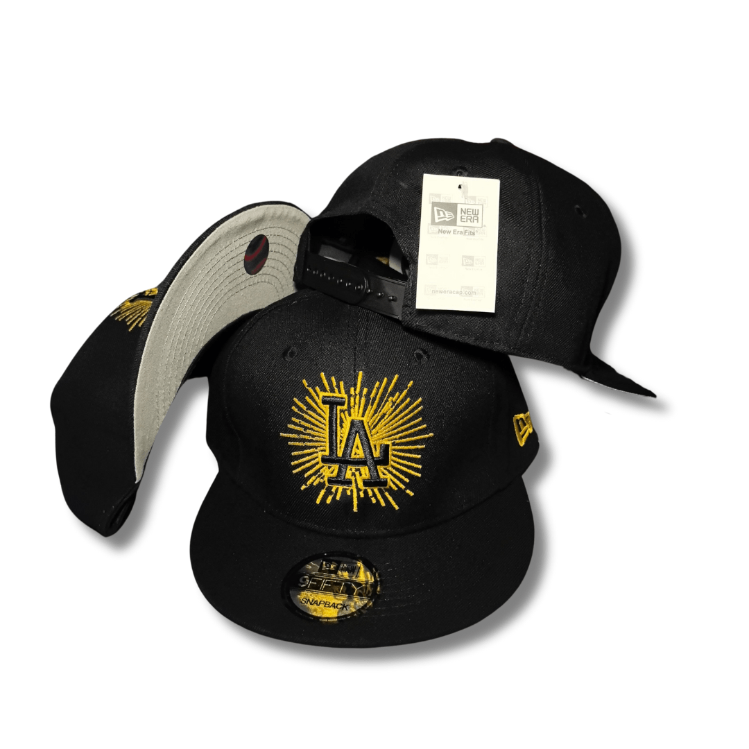 Show off your Dodgers pride with this sleek and stylish black snapback cap. Featuring a radiant gold embroidered Los Angeles Dodgers logo that resembles sunburst rays, this cap is perfect for standing out in the crowd.