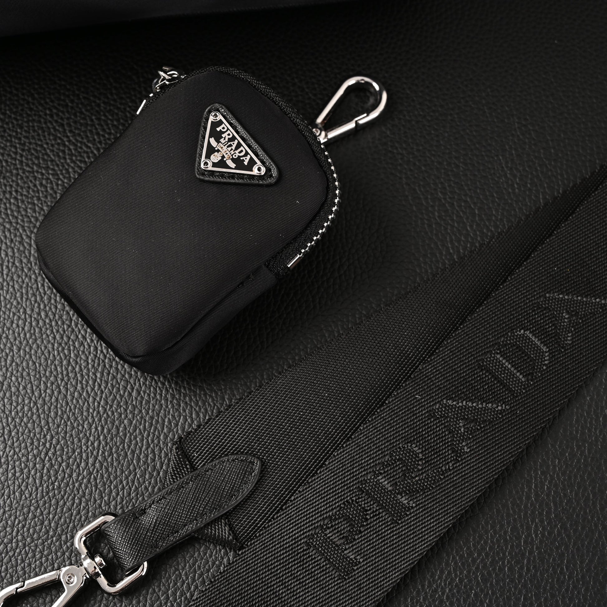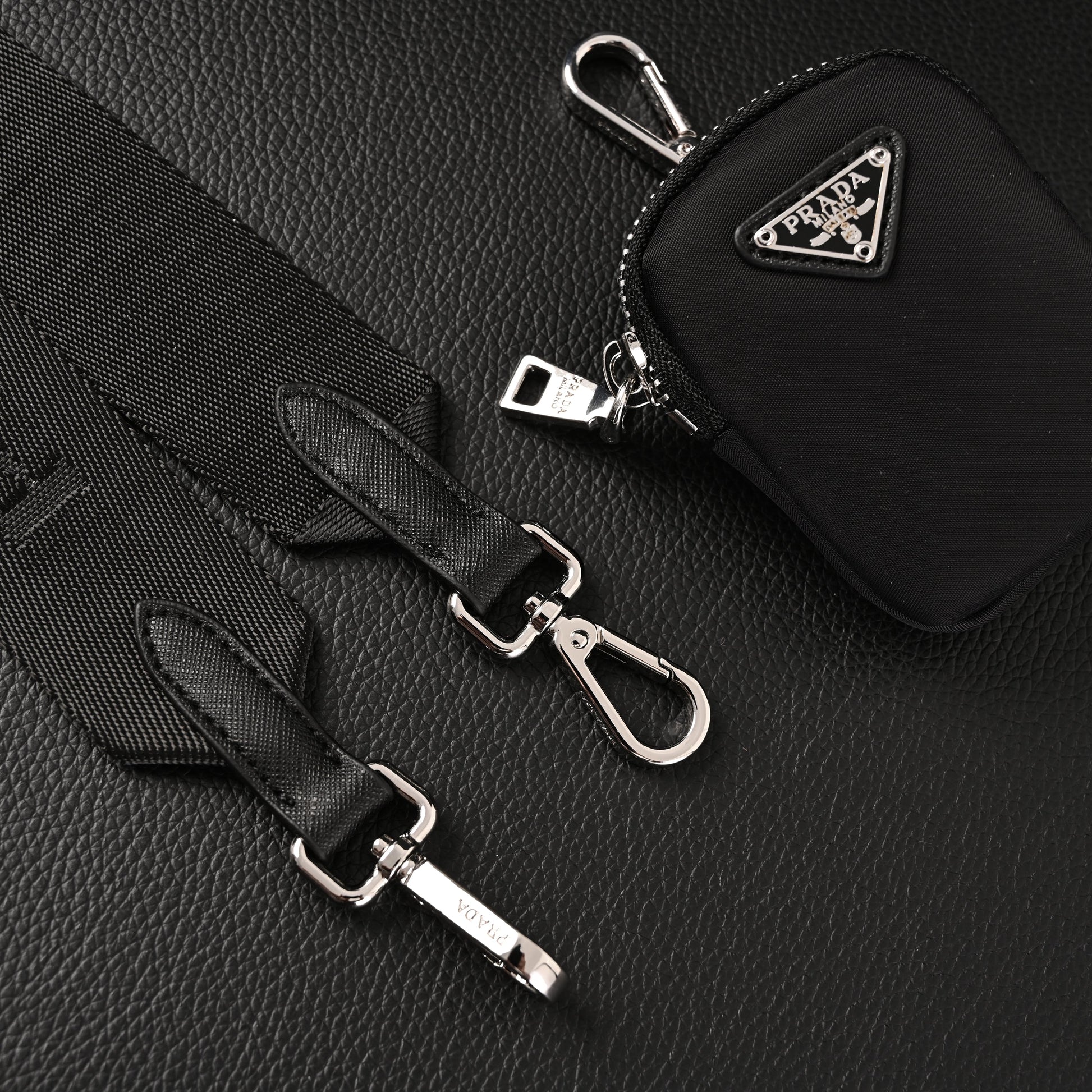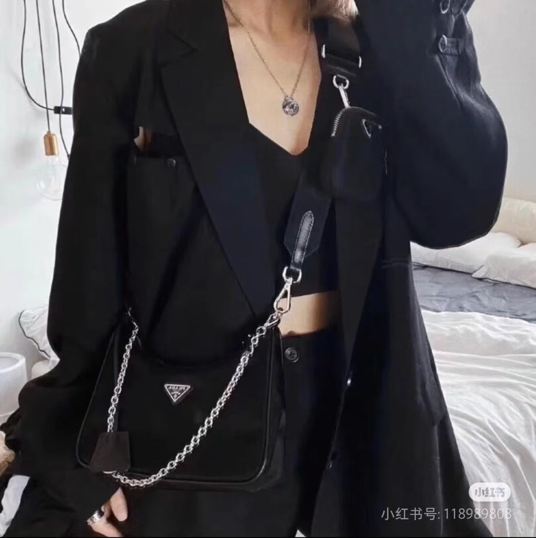 With its sleek black finish, detachable chain handle, and adjustable fabric strap with embroidered Prada logo, the bag is versatile enough for casual day wear or elevated evening looks. The design also features a removable nylon pouch—a stylish and functional detail that adds to its practicality.